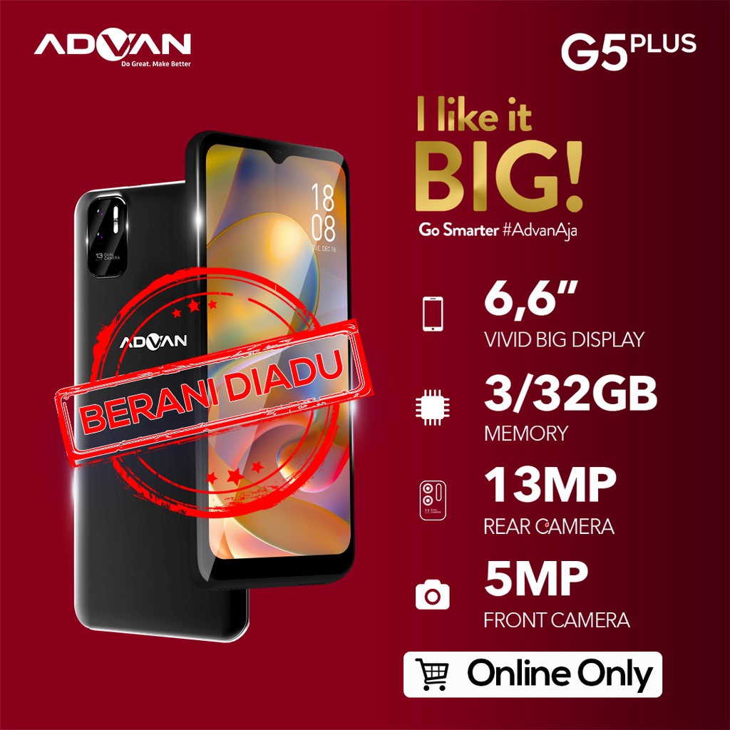Harga Advan G5 Plus (Black) 6.6 HD+ 2.5D Glass 3GB 32GB Octacore 1.6GHz Android 11 Garansi Resmi saat ini masih murah hanya Rp. 1.199.000,00, kita tidak akan pernah tahu tentang Harga ini di masa depan, juga stok barang ini nanti atau besok hari, bisa saja harganya naik tinggi atau bisa juga stok sudah Habis.
